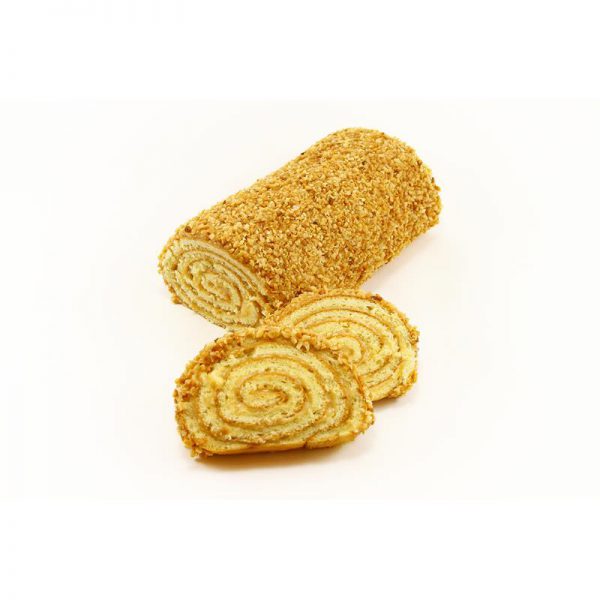 Нежный рулет из бисквитного теста с ванильно-сливочной начинкой и арахисом.