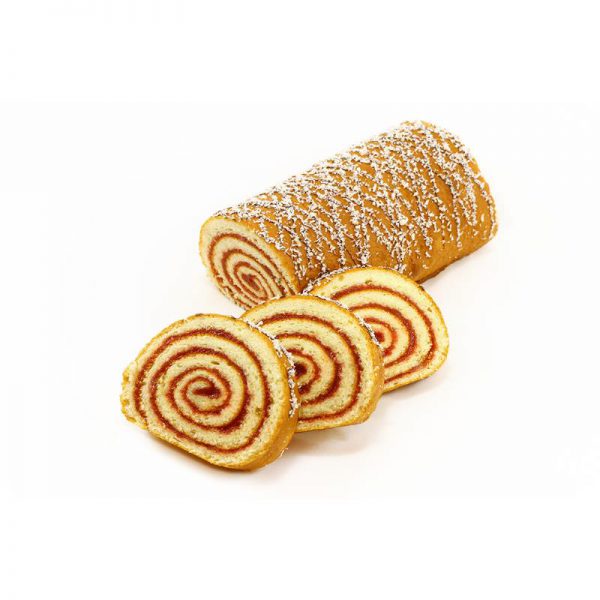 Нежный рулет из бисквитного теста с прослойкой из фруктового джема, с отделкой темной глазурью и кокосовой стружкой.