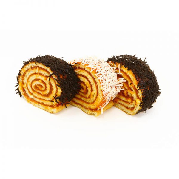 Нежный рулет из бисквитного теста с прослойкой из фруктового джема, с отделкой темной и белой шоколадной соломкой.