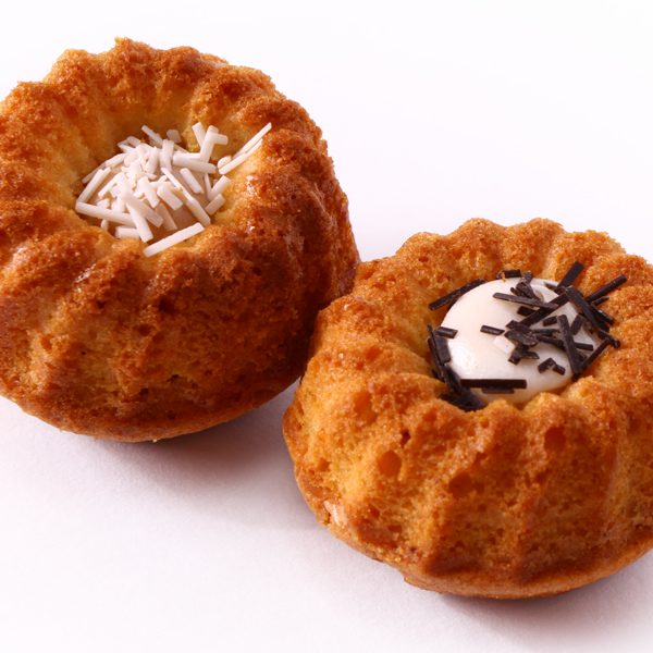 Воздушный, нежный, ароматный кекс в сочетании с начинкой “Крем-брюле” или “Карамельной”, с отделкой темной и белой шоколадной соломкой.