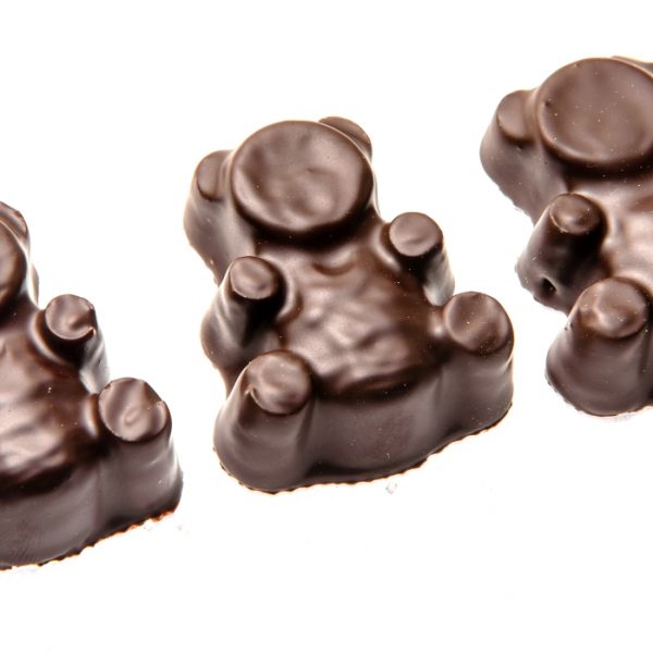 Мармелад с различными фруктовыми и ягодными вкусами в форме мишек, полностью глазированный темной глазурью.