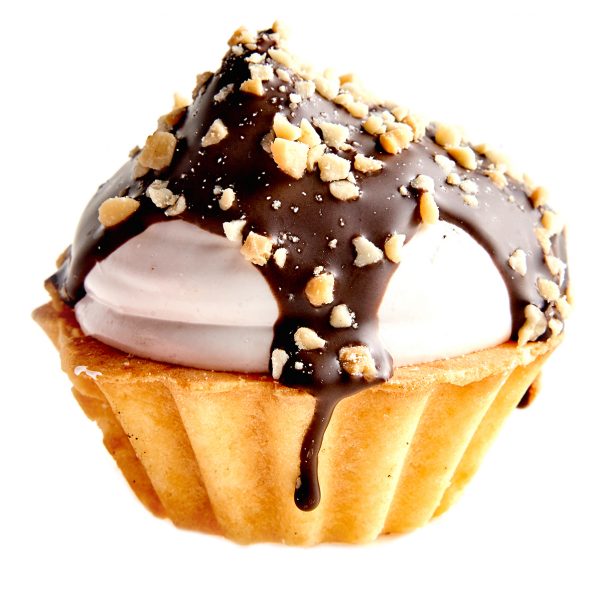 Воздушный ванильный зефир, комбинированный со сдобным печеньем в форме корзиночки, с фруктовым повидлом, с отделкой темной кондитерской глазурью и жареным арахисом.