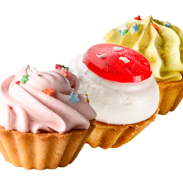 Воздушный ванильный зефир, комбинированный со сдобным печеньем в форме корзиночки, с фруктовым повидлом, с отделкой нежным фруктово-ягодным мармеладом и карамельной посыпкой.