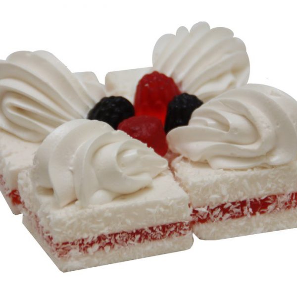 Нежная пастила с прослойкой из мармелада с фруктово-ягодным ароматом, с отделкой зефиром, кокосовой стружкой и фигурным мармеладом.