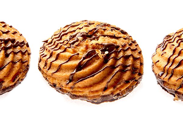 Рассыпчатое сдобное печенье с начинкой “Вареное сгущенное молоко”, частично глазированное (донышко), с отделкой темной кондитерской глазурью.