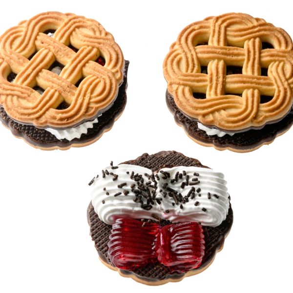 Сахарное печенье с ароматом ванили, частично глазированное темной кондитерской глазурью, с отделкой и прослойкой из зефира и джема