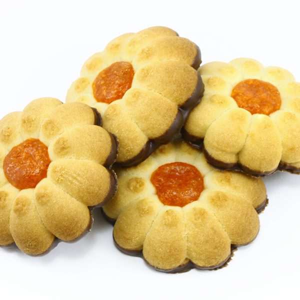 Сдобное печенье с отделкой повидлом, частично глазированное темной кондитерской глазурью.