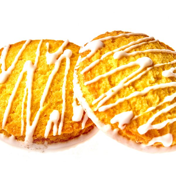 Сдобное печенье с ароматом лимона, частично глазированное (донышко), с отделкой белой кондитерской глазурью
