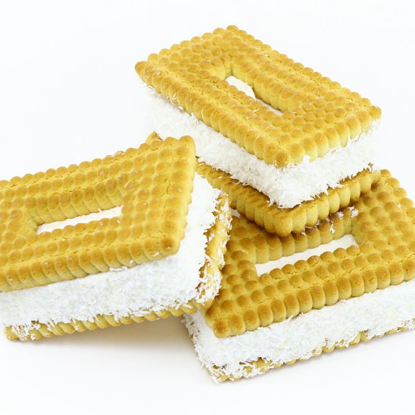 Сахарное печенье с ароматом ванили, с прослойкой из зефира, в кокосовой стружке.