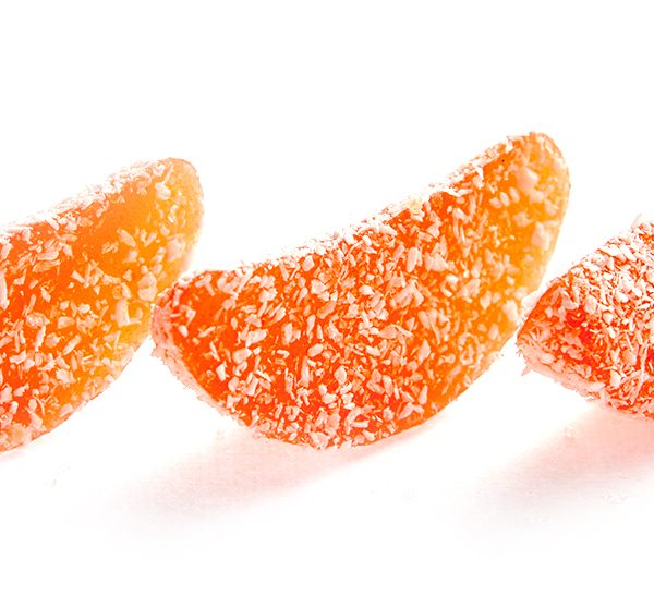 Мармеладные фигурки в форме мандариновых долек с различными ароматами и цветами в кокосовой стружке.