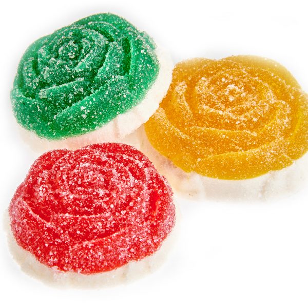 Мармеладный микс с незабываемыми вкусами клубники, лимона, яблока, апельсина в форме розы с прослойкой из зефира в сахаре.