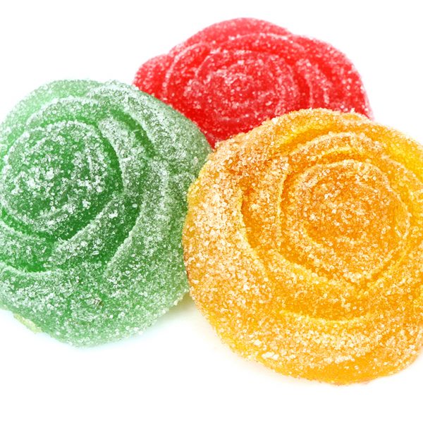 Мармеладный микс с незабываемыми вкусами клубники, лимона, яблока, апельсина в форме розы, в сахаре.